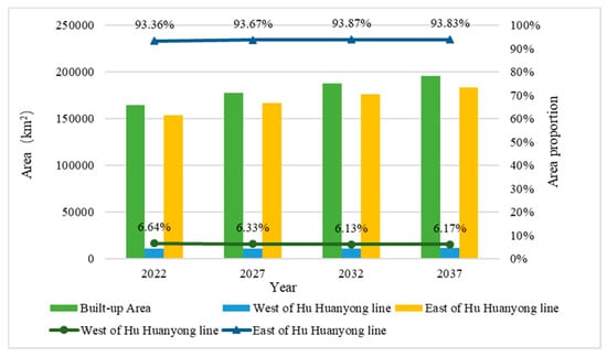 Taking 2017 as the base year and presetting the prediction interval as five years, we simulated the variation of urban built-up areas in China in 2022, 2027, 2032, and 2037 (Figure 4). We also conducted a comparative analysis on the urban sprawl on two sides of Hu’s line. The term “Hu’s line” represents the boundary line of the spatial distribution of China’s population density, which was discovered by Hu Huanyong. At the same time, Hu’s line is also the dividing line between China’s eastern and western population, economy, and other important human factors. According to the statistics of the simulation results, the urban built-up area in China, the urban built-up area on both sides of Hu’s line, and the proportion of urban built-up areas on both sides of Hu’s line of the total urban built-up area of China from 2022 to 2037 could be obtained (Figure 5).
