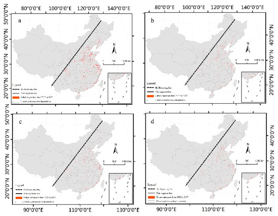 In the future, from 2022 to 2037, the hotspot areas of urban sprawl in China will change over time. Although the scale of urban sprawl in the Beijing-Tianjin-Hebei region, the Yangtze River delta, and the Pearl River delta will still be considerable, the urban sprawl scale in the Chengdu-Chongqing city cluster, the Guanzhong Plain city cluster, the Central Plains city cluster, and the middle reaches of the Yangtze River will be more prominent. There will be a large gap between the numbers of urban build-up areas in the eastern and western sides of Hu’s line. Under current environmental and socio-economic conditions, it is difficult for urban sprawl in China to break the limits of Hu’s line in the near future.