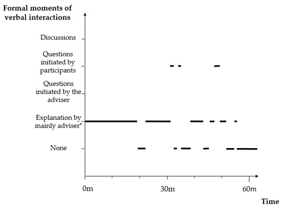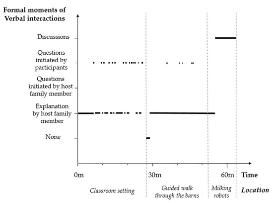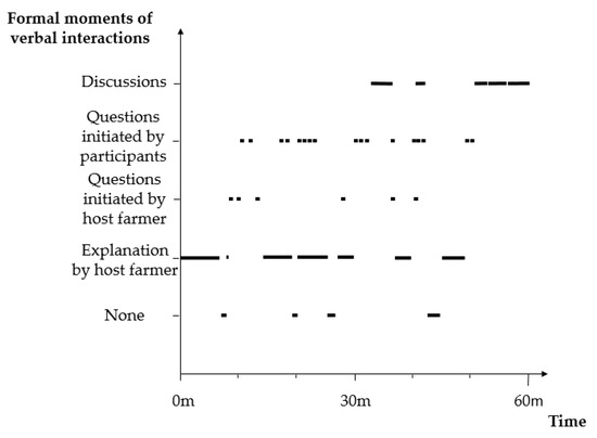 Categorised formal moments of verbal interactions over time, Case 2. * During the first block of explanation, the host-farmer himself elaborates on the history of the farm for 3 min.