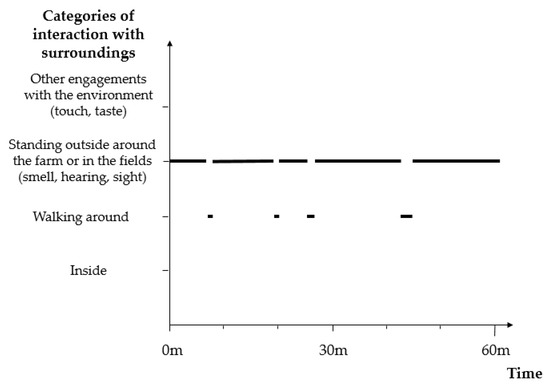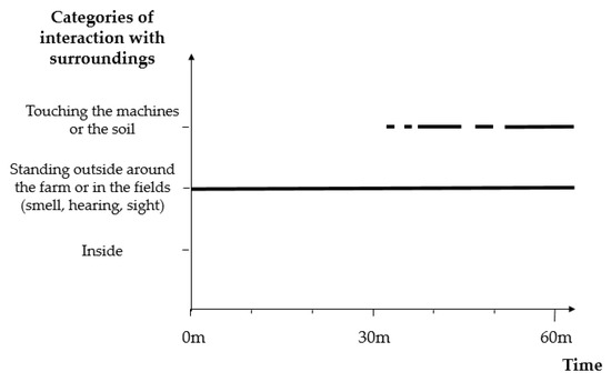 During Case 3, attendees engaged in six short walks initiated by the demonstrator, each time to another point at the farm, ending at the new milking robots. Some of them touch a cow while passing by in the barn and everyone has to wear shoe covers when coming out of the presentation room and entering the new barn. Apart from these sensory experiences, smelling, watching and listening, participants are not engaged in other specific opportunities. Since a figure of the interactions with the environment over time during Case 3 would resemble the figure of Case 1, we did not include it.