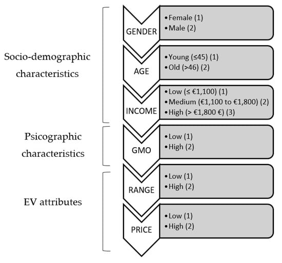 Research grounded in innovation theory [11] posits that there are different typologies of potential adopters of EVs, which are often linked to the time lapse between the product’s launch and its adoption. Today, EVs remain in the early stages of the adoption in Spain, which raises the importance early adopters in this process as this typology of consumers tends to adopt new technologies faster than market segments [12,13,14]. As a result, this market segment remains key to research on EVs and has been analysed in various countries around the world. In order to define the characteristics of early adopters, scholars have used a wide array of factors that can be clustered into two key categories, namely individual-related variables and EV attributes [15]. Common examples of the first category include age, gender, income, education level [16,17], social influence, environmental concern, and innovativeness [18,19]. Attributes used in earlier research studies to analyse consumer behaviour related to the adoption of EVs include price [20], driving range [21], availability of charging points [22] and vehicle acceleration [23].