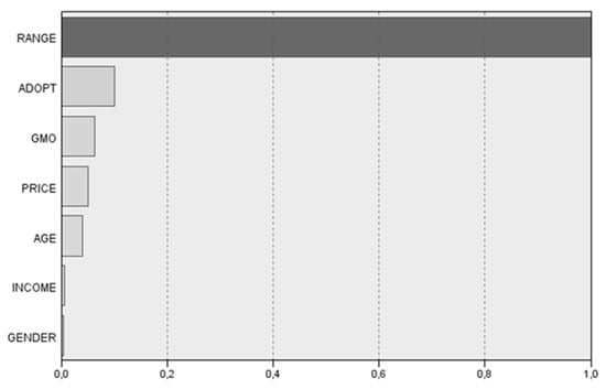 The importance of predictor variables is shown in Figure 2, with vehicle driving range emerging as the most important variable (importance of 100%) for the classification of respondents and the creation of segmentation profiles. This variable was followed by GMO and price, with levels of importance of 6% and 5%, respectively.