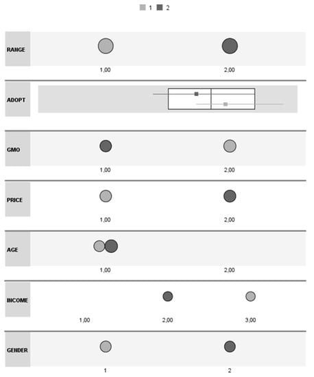 In the second cluster, the prevailing profile includes mostly male respondents (51.3%), younger people (69.6%) and respondents with a medium income level (39.3%). Most respondents in this cluster had a low GMO (57.6%), and a very negative perception of EVs’ limited driving range (100%) as well as their price (61.8%). The average intention to adopt EVs among respondents in this cluster was of 4.52 out of a maximum of 7. All in all, this cluster would appear to include primarily respondents with a low intention of adopting EVs. Table 5 summarizes the composition of each variable in each group and Figure 3 illustrates visually the characteristics of these two clusters using SPSS software.