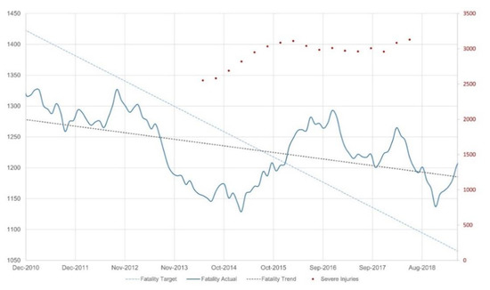 Australia’s National Road Safety Strategy progress to June 2019 showing the actual road fatality trend compared to the targeted reduction. Reproduced with permission from C. Newland, 25 March 2020 [16] (p. 5).