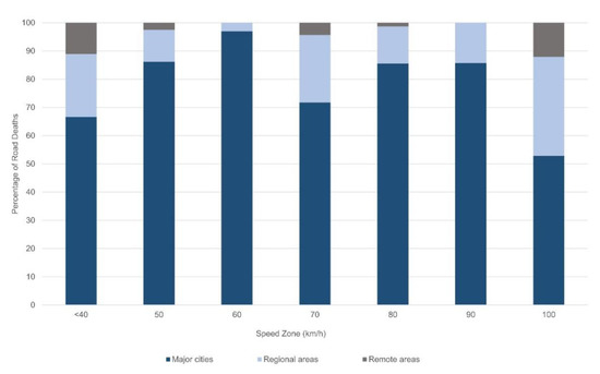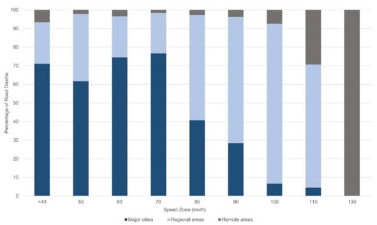 A more detailed analysis of fatal crashes by speed zone demonstrated that high speed crashes are particularly problematic in regional and remote areas. Specifically, over 70% of road deaths in Australia and almost 85% of deaths in New Zealand during the 5-year period investigated, occurred in speed zones of 90 km/h or above, a finding supported independently by New Zealand’s Transport Authority [97]. Gee (2019) noted that 87% of New Zealand’s roads have speed limits that are excessive for the road conditions: a concern equally noted by the most recent Austroads report on regional road safety [3,97]. Also concerning was that in Australia, of all deaths where speed zone was known, approximately one third (36%, n = 1310) occurred in zones signed at 70 km/h or less (independent of remoteness level); theoretically, the biomechanically tolerable travel speed in the presence of Safe System compliant infrastructure and 5-star rated vehicle design [27,28,98,99,100].