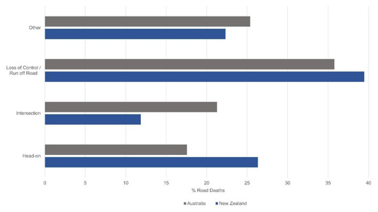 Loss of control crashes were responsible for the majority of fatalities in New Zealand (40%) and Australia (35%). Lane keep assist technologies with the aid of autonomous emergency braking, electronic stability control and traction control technologies are likely to prevent such crashes, should the correct infrastructure be present. While head-on impacts accounted for 27% of the fatal crashes in New Zealand, cross-traffic or intersection crashes were responsible for many of the deaths in Australia (22% of fatalities).