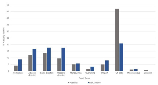 Crash types in Australia (2013–2017) and New Zealand (2012–2016). ‘Other’ crash type refers to those which involve overtaking, rear-end crashes and obstruction.