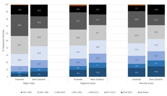 According to the 2018 Australian Motor Vehicle Census [56], of the 22.8 million vehicles registered in Australia (including vehicle types not otherwise included in publicly reported registered vehicle counts), 64% of all vehicles were registered in major cities, while 33.6% were registered in regional areas in Australia and 2.4% were registered in remote Australia. Figure 6 presents a distribution of registered vehicles by remoteness and year of manufacture (YOM) in Australia and New Zealand. Within Australia, in major cities, while 15% of vehicles have a YOM date pre-2000, in regional areas and remote areas, 25% and 29% of all registered vehicles were manufactured pre-2000. Conversely, while 42% of vehicles registered in major cities were manufactured in or after 2011, only 30% of registered vehicles in remote areas were ‘new’. A more refined breakdown of YOM (for vehicles manufactured post-2000) is presented in the Appendix A (Figure A4 and Figure A5). The data shows ownership of newer vehicles by residents in regional and remote areas is comparable to their city-dwelling counterparts.