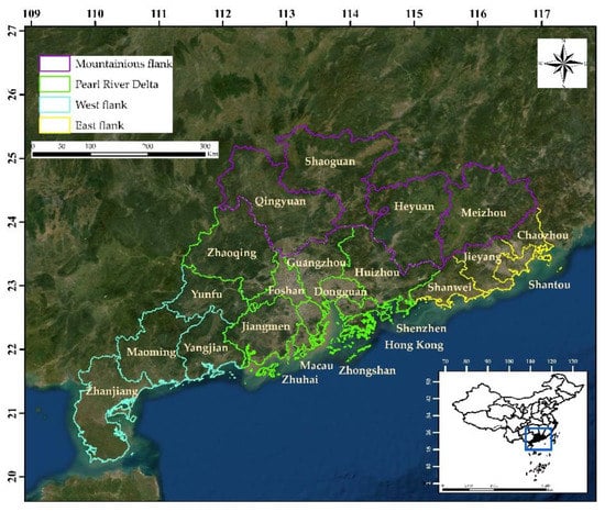 The region of Guangdong, Hong Kong, and Macao is located between latitudes 20°13′ N and 25°31′ N, and longitudes 109°39′ E and 117°19′ E and has an area of about 196,342 km2 (Figure 1). GHKM is situated in the southernmost part of China, and is a main economic hub of the country. The study area shared its eastern boundary with Fujian province, northern boundary with Jiangxi and Hunan provinces, western boundary with Guangxi, and a southern boundary with the South China Sea []. The geography of the study area is characterized by plains, plateaus, mountains, hills, and rivers. Its climate is categorized by hot, humid summers and cold, windy, dry winters. The mean annual precipitation and temperature are 1500–2000 mm and 22 °C, respectively [,]. The availability of infrastructure has been supported by government and local authorities since the opening of the economic reform policy, 1978 and has successfully enjoyed economic prosperity. This has made Guangdong, Hong Kong, and Macao the international, cultural, and political communication center of China. This region has experienced an increase in population, socioeconomic development, and changes in land use land cover over the past three decades. The significant surge in urban area has predominantly come from the conversion of farmland into built-up areas []. The increase in population is mainly the result of immigration. Guangdong, Hong Kong, and Macao accommodate ever more unsatisfactory, jam-packed transportation systems, and consequent environmental pollution [].