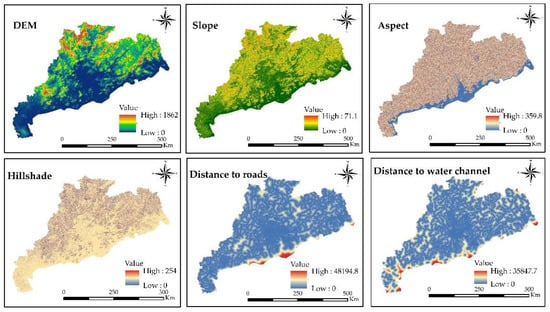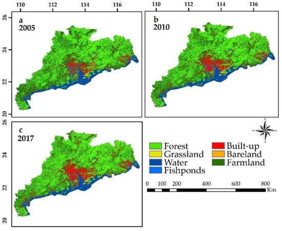 The land use land cover data for the Guangdong, Hong Kong, and Macao for the years 2005, 2010, and 2017 have been produced in the author’s previous study, which was based on the supervised classification of multi-temporal Landsat data (thematic mapper (TM)/enhanced thematic mapper (ETM+)/operational land imager (OLI)) at a 30 m resolution []. The China National Standard Land Use Classification System [] was followed to define land use land cover classification scheme which comprises on seven classes, forest, grassland, water, fishponds, built-up, bareland, and farmland. The overall accuracy of the classified land use land cover maps is about 91% and kappa is 0.88 []. Other data sets include Shuttle Radar Topographic Mission (SRTM) 30 m Digital Elevation Model (DEM) downloaded from the 30 m SRTM Tile downloader [], as well as road network data and water channel network data obtained from the “Open Street Map (OSM)” []. Slope, aspect, and hillshade were derived from the DEM. All the data were projected to a common Universal Transverse Mercator (UTM) projection, i.e., WGS-84-UTM-Zone-49N, with spatial resolution of 30 m.