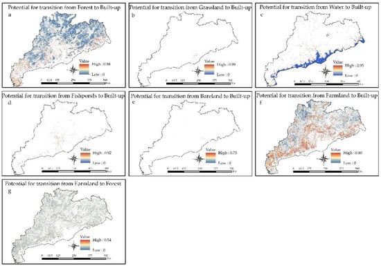 Transition potential maps from (a) forest to built-up (b) grassland to built-up, (c) water to built-up, (d) fishponds to built-up, (e) bareland to built-up, (f) farmland to built-up, and (g) farmland to forest.