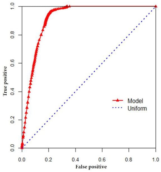 Simulated and actual land use land cover maps of 2017 are shown in Figure 5. Their area statistics of different land use land cover classes are shown in Table 8. Visual interpretation of the modeling results shows that the simulated map for the year 2017 is reasonably similar to the actual map for that year. A more detailed analysis was accomplished using the Kappa variations and relative operating characteristics. Kappa variations that compared the projected land use land cover map with the actual land use land cover map of the year 2017 resulted in a Kappa value = 0.97, Kno = 0.97, Kappa location = 0.99, and k standard = 0.96, whereas the relative operating characteristics value, i.e., area under the curve is 0.914 (Figure 6). Thus, high values of both Kappa and relative operating characteristics suggest that the majority of the study area experienced no change, indicating the consistency is quite strong between the predicted results and the actual land use situation. However, model predict less forest cover and more built-up area and fishponds than the actual land cover map. Both Kappa and relative operating characteristics results confirms that the model is reliable for the Guangdong, Hong Kong, and Macao and can be used to predict future land use land cover change under different scenarios.