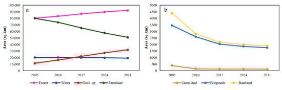 Area of the land use land cover classes (a) forest, water, built-up, and farmland, (b) grassland, fishponds, and bareland over the years 2005, 2010, 2017, and predicted 2024 and 2031.