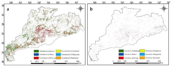 In order, to examine and understand the influence of land use land cover change on green lands (i.e., forest and farmland) and the key role of urbanization, Figure 9 shows the conversion of farmland and forest into other land use types. The spatial visualization provided by the Land Change Modeler shows that, in the next 14 years, built-up areas represent the most momentous land use land cover class and will negatively affect the farmlands. Figure 9b shows that the forest cover will continue to increase in the Guangdong, Hong Kong, and Macao over the next 14 years.