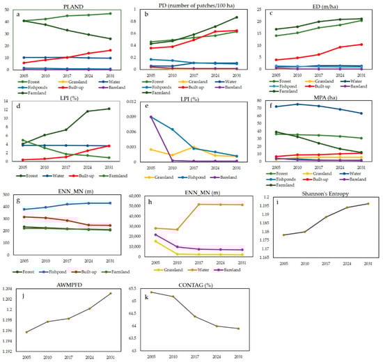 Temporal patterns of landscape metrics from 2005 to 2031 (a) Percentage of landscape (PLAND), (b) Patch density (PD), (c) Edge density (ED), (d,e) Largest Patch Index (LPI), (f) Mean patch area (MPA), and (g,h) Euclidian Mean Nearest Neighbor Distance (ENN_MN) at class level, whereas, (i) Shannon’s diversity index (SDI), (j) Area Weighted Mean Fractal Dimension (AWMPFD), and (k) Contagion (CONTAG)) at landscape level.