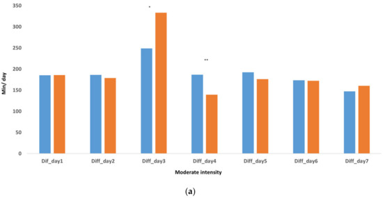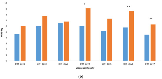 From these values, we observed significant differences in the intensities of PA performed by the Experimental and Control groups. Differences between Pre and Post were especially significant for day 3 (p = 0.017) and 4 (p = 0.006) at a moderate intensity, (Figure 5a) and for day 4 at a vigorous intensity (p = 0.041), as well as day 6 (p = 0.015) and day 7 (p = 0.005) (Figure 5b).