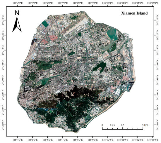 The high-spatial-resolution (HSR) RS data for Xiamen Island come from Google Map and were obtained in October 2018, with a resolution of 0.5 m (Figure 1). The data of land use and the number of floors of each building come from the Xiamen Municipal Natural Resources and Planning Bureau. Among them, the land use types are divided into 10 categories (residential area, public management and public service area, commercial area, urban green space, water, industrial area, transportation area, special function area, agricultural and forestry area and other types). The urban green space distribution comes from the land use data and includes main park green space, production protection green space and scenic area green space in the city, which can provide green space for recreation and relaxation. The road congestion data related to urban air pollution sources come from the comprehensive analysis of the 2018 annual road traffic operation report [47] issued by the traffic police detachment of the Municipal Public Security Bureau and the traffic congestion index of intelligent transportation of Baidu Map [48]. Another source of urban air pollution considered in this paper is the list of key air pollution enterprises in 2018 released by the Xiamen Environmental Protection Bureau [49]. The precipitation distribution data come from the Resource and Environment Data Cloud Platform of the Institute of Geographic Sciences and Natural Resources Research, Chinese Academy of Sciences [50]. Landsat 8 data obtained on August 21, 2019 (clear weather in summer) for surface temperature inversion are downloaded from the United States Geological Survey (USGS). The population density data come from the Easygo Heat Map, which are location-based service (LBS) products of a social network-based Chinese technology company named Tencent.
