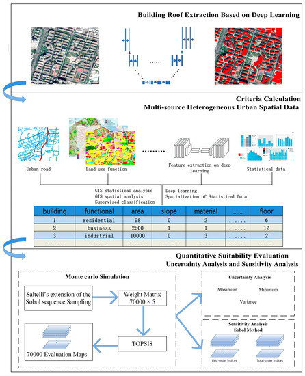 In this paper, the suitability evaluation criteria of roof greening are considered comprehensively, which involves the building itself, the environment, and social and demographic aspects. First of all, the roof patches of buildings are extracted accurately from the remote sensing image by using the deep learning method, and the roof patches are exactly matched with the remote sensing image. Then we calculate the evaluation criteria quantitatively based on RS, GIS and location-based Internet services technologies. Next, the technique for order preference by similarity to an ideal solution (TOPSIS) method [42] is used in this paper to consider multiple criteria to obtain comprehensive evaluation scores. Monte Carlo simulation (MCS) [43] is used to simulate different weights and repeat TOPSIS method many times to get stable evaluation results. As a well-known multicriteria decision-making analysis method, TOPSIS has been applied in the evaluation of sustainable urban development [44], mineral potential mapping [45], the quantification of the vulnerability of urban landscapes to land use changes [46] and so on. Finally, this paper conducts uncertainty and sensitivity analyses on the evaluation results and quantitatively analyzes the influence of the change in criteria weights on the final evaluation results of roof greening suitability. This evaluation method is not only at the theoretical level but also practical and computable. Multisource data with rich and fine-grained forms are used in this paper to establish a reusable and interpretable evaluation method for roof greening suitability.