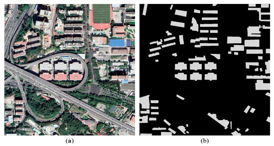 Rapid and accurate extraction of building roofs is the premise of roof greening suitability evaluation. To overcome the disadvantage of artificially designed features in traditional methods that ignore the contextual information in images [51,52,53], this paper used the semantic segmentation in deep learning method to extract the roof profiles of buildings. The specific network structure is D-LinkNet, which includes an encoder-decoder structure, a pretrained encoder and dilated convolution for building roof extraction tasks [41]. First, 27 sample image patches (with the size of each patch being 1000 × 1000 pixels) were selected uniformly throughout the study area. The sample area should include all types of buildings in the study area to the greatest extent possible. One of the original sample images and the corresponding label images are shown in Figure 3a,b. All buildings’ roofs in the sample patches needed to be labeled, and the rest were used as background. In this way, building extraction can be regarded as a binary semantic segmentation task. After semantic segmentation, many attempts were needed to choose the appropriate threshold for binarization and to vectorize the building patches based on the results of binarization. The process of binarization and vectorization could be performed using ArcGIS 10.2 software.