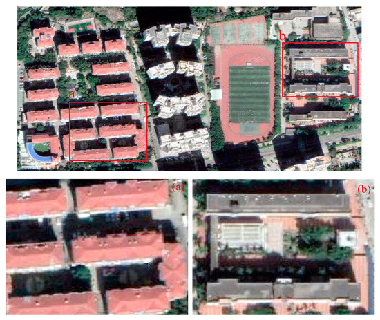 The roof slope is one of the decisive criteria for determining whether a roof can be greened or not. In the two-dimensional image space, it is difficult to calculate the exact roof slope value. However, in a submeter high-resolution image, the ridge in the middle of the pitched roof can be seen clearly, as shown in Figure 4. Furthermore, sloped roofs are usually made of tiles and fiberglass-reinforced plastic, which are obviously different from flat roofs with steel-reinforced concrete structures and parapets. These are important semantic information that can be used to distinguish pitched roofs from flat roofs. Therefore, different semantic segmentation models can be designed to distinguish pitched roofs from flat roofs. The samples used in the aforementioned part on deep learning roof extraction needed to be relabeled. The labeling method was the same; the difference was that only sloped roofs were chosen as the foreground in this part, with others chosen as background.