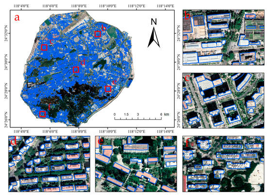 The results of roof extraction are shown in Figure 5. The five randomly selected small areas are shown in subfigures (b–f). The roofs of most buildings could be extracted accurately, which was the premise of subsequent experiments and analyses. To quantitatively reflect the effect of roof extraction, this paper used the intersection over union (IOU) and pixel accuracy (PA) based on a confusion matrix, which are commonly used indicators in computer vision tasks, to evaluate the accuracy of the roof extraction results based on deep learning. Specifically, the IOU was used to reflect the fitting degree between the extracted roof patches and the actual roof patches. The confusion matrix, IOU and PA are defined as follows (Table 1):