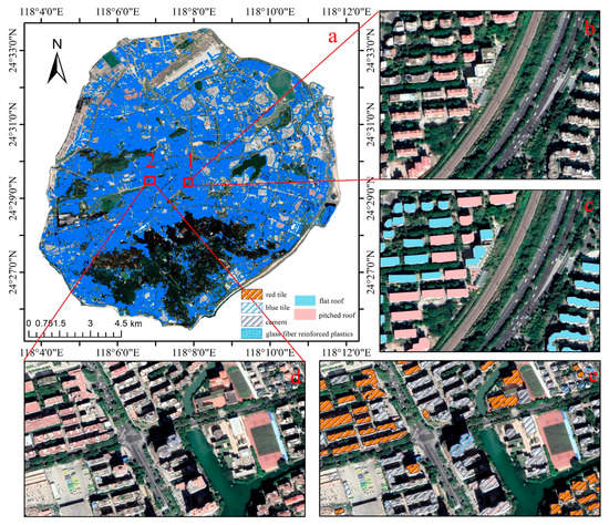 Roof slope and material extraction results: (a) results of building roof extraction on Xiamen Island; (b) and (c) original image and roof slope recognition results of corresponding subarea 1; (d) and (e) original image and roof material recognition results of corresponding subarea 2.