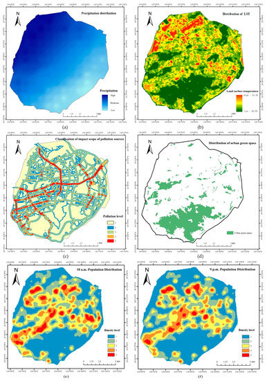 The spatial distribution of 5 non-decisive criteria of suitability in the study area: (a) the distribution of precipitation in the whole island; (b) the surface temperature distribution obtained by RS thermal infrared band temperature inversion; (c) the classification of the impact scope of air pollution sources. Levels 1–5 mean different severity degree of air pollution. The larger the number is, the more serious the air pollution is; (d) the spatial distribution of urban green space; (e) the classification of the population density distribution at 10 a.m. on weekdays. Levels 1–5 mean the classification of population density. The larger the number is, the denser the population is; and (f) the classification of the population density distribution at 9:00 p.m. on weekdays.