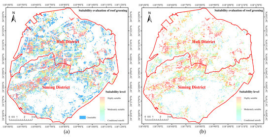 Suitability evaluation of roof greening on Xiamen Island: (a) including roofs that do not meet the requirements of roof greening; (b) including only the roofs that meet the requirements of roof greening.