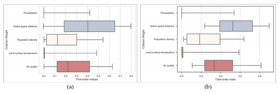 The Sobol method [72,73] aims to conduct global sensitivity analysis within the framework of probability and to decompose the variance of the results into each input variable. This experiment decomposes the variance of the final evaluation scores of roof greening suitability to the weights of five non-decisive criteria. As shown in Figure 9a,b, both the first-order indices and the total-order index have a similar performance. The sensitivity of the final TOPSIS scores to the weights of the five criteria ranked in order from strong to weak is: green space distance, air quality, population density, land surface temperature, precipitation. The results of the sensitivity analysis also correspond to Figure 7a–f and Figure 8b. Clearly, In the roofs that meet the requirements of green roof retrofitting, the top ranked roofs show a significant positive correlation with the distribution of the air pollution level and population density and a significant negative correlation with the distance to urban green space. The results of the quantitative suitability evaluation indicate that each roof has a specific score and ranking value, which are the basis for urban planners to carry out roof greening retrofitting in batches. In addition, the sensitivity analysis of the evaluation results clearly suggests that planners should introduce more empirical knowledge to determine the weights of the criteria that are more sensitive. It should be noted that the results of sensitivity analysis are the relative sensitivity of five criteria in the current study area. In different research areas, researchers consider different impact criteria, and the spatial distributions of criteria data are also different, so the results of relative sensitivity analysis between criteria will be different. This is also in line with the idea that roof greening retrofit should adapt to local conditions.