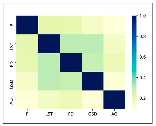 Correlation analysis of 5 non-decisive criteria: P, LST, PD, GSD and AQ are abbreviations of precipitation, land surface temperature, population density, green space distance and air quality respectively.
