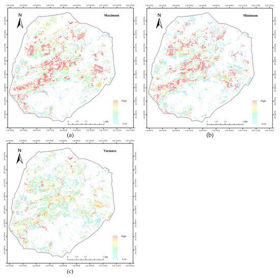In the study area, 70,000 MCSs were carried out on all roofs that met the requirements of roof greening. In the 70,000 scores for each roof, the statistical indicators of these scores could be calculated. The maximum and minimum scores and the variance of each roof are shown in Figure 11a–c, respectively. In Figure 11a, low-value areas need to be noted because when the maximum value of 70,000 simulations of a building roof is small, this roof has consistently low-value scores. In contrast, in Figure 11b, when the minimum value is large, this roof has consistently high-value scores. The variance of the simulation scores is shown in Figure 11c. Comparing the three figures in Figure 11, we find that the maximum and minimum scores of roofs with small variance usually belong to the high-score part or the low-score part together. The large difference between the maximum and minimum values of a roof with large variance indicates that the score of the roof is uncertain.