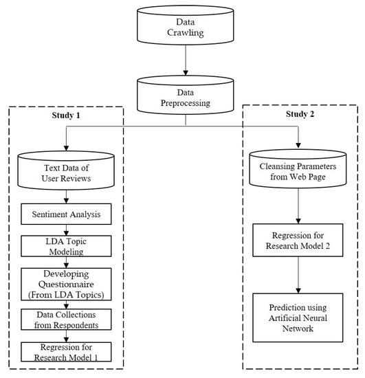 The research purpose was to identify important factors for online sales of organic products, to predict the online sales of organic products, and to suggest web marketing strategies for organic product sales. In order to verify the research purpose, this research constructed two research models and established two research processes. This research mainly collected unstructured data on Taobao organic product reviews, prices, product fans, price discounts, the number of customer reviews, organic labeling, and free delivery. By crawling the comments of Taobao, first the sentiment analysis method was used to divide the reviews into positive and negative reviews, the Latent Dirichlet Allocation (LDA) analysis method was used to find the topic words in positive and negative reviews. A linear regression analysis method was used to test the relationship between subject words and satisfaction in identifying important factors for online sales of organic products. At the same time, we used data collected from various variables, such as prices, product fans, price discount, the number of customer reviews, organic labeling, and free delivery, to determine the relationship between each variable and the sales volume, and to predict the online sales of organic products a neural network analysis method was used. The research process is shown in Figure 2 below.
