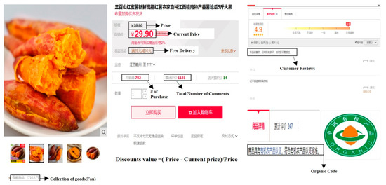 The purpose of this research was to identify important factors for online sales of organic products, to predict the online sales of organic products, and to suggest web marketing strategies for organic product sales. This research mainly used Taobao as a platform to collect data. Taobao is one of the fastest growing online B2C markets in China and has 721 million users, and sales have increased year by year [76]. Agricultural products are produced and processed according to the principles of organic agriculture and organic agricultural production methods and standards, certified by organic food certification agencies, for example, organic grains, organic fruits, organic vegetables, etc. Therefore, this study mainly collected data on organic products on Taobao, searching for related products by keywords, such as organic fruits, organic vegetables, organic rice, organic red beans, organic beef, organic pork, organic egg, and other organic products. A Python-based web crawler was developed to retrieve the relevant data. Python is a high-level scripting language that combines interpretability and compiled, interactive, and object orientation. The web crawler simulates the browser access to network resources and automatically collects the content of the accessed web pages in order to quickly and efficiently obtain the required content [77]. Thus, we developed our own web crawler to collect the data from web data. The period of data collection was from September 8 to September 18, 2019. Data from a total of 9040 organic products were collected, and there were 3446 organic products with reviews out of collected reviews on 506,001 organic products. This research mainly collected data with the titles of organic products’ price, current price, free delivery, sales volume, number of customer reviews, customer reviews, organic labeling, and product fans. The data collected is shown in Figure 3 below.