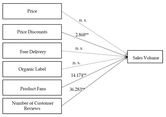 The main research purpose of this part is to predict the impact of consumer purchases of organic agricultural products by crawling the six variables of prices, product fans, the price discount, number of customer reviews, organic labeling, and free delivery. Based on the crawled data, regression analysis was used. β represents the standard regression coefficient. The results showed that product fans, the number of reviews, and price discount had a positive correlation with the sales volume. The t-value is the result of a t-test of the regression coefficients. The larger the absolute value, the smaller the sig, sig represents the significance of the t-test. Statistically, a sig less than 0.05 is generally considered to be significant for the coefficient test. It shows that the independent variable can effectively predict the variation of the dependent variable. The results of the regression model showed that the significance of product fan, price discount, and number of customer reviews were all below 0.005, and all three variables that affect sales passed. The results are shown in Table 7.