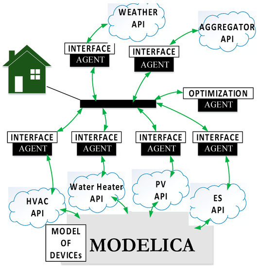At the residential level (or at each home), an additional framework of agents and APIs was created to establish flexibility and fidelity of the residential models and controls, as presented in Figure 4. At the building level, agents are present that extract data (value signal) from the aggregator, perform optimization and decision-making, and distribute the resulting control commands to other agents who interface with a set of APIs that control building equipment. Details of the agents are provided in Table 2.