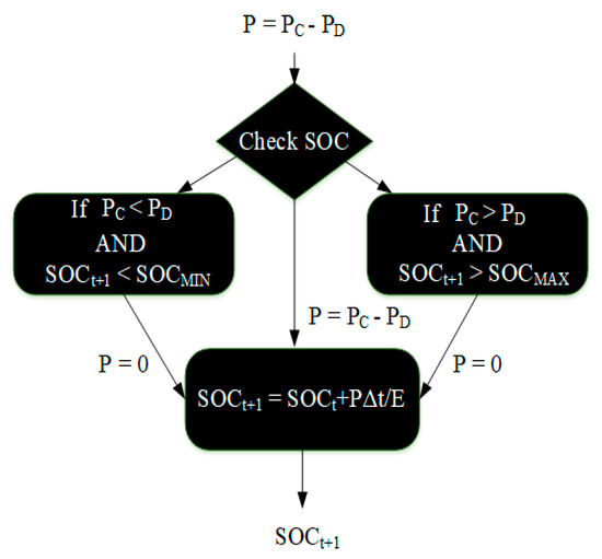 In developing the ES model, the primary concern is the energy entering and leaving the energy storage system during the time interval. This is captured in the element state of charge (SOC), which represents the percentage of energy within the energy storage system in relation to the capacity of the energy storage medium. The battery model includes losses for charging and discharging and steady-state losses for powering the required electronics when the battery storage controls are on. The storage model also limits the maximum charging/discharging rate of the battery to the specified limit, and maintains the SOC within prescribed limits to ensure battery functionality and reliability. The charge and discharge effects on the energy storage system are given by Liu et al. [52]. Figure 5 shows the ES model diagram.