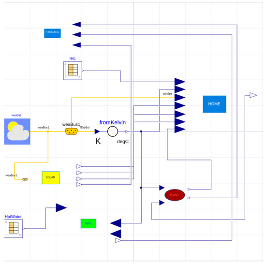 A building model represents the residential home dynamics that receive IHLs (QIHL in Equation (1)) and the weather file (weaDat) as inputs. The HVAC model also receives weather data as an input. The PV model is incorporated in the storage model representing the energy storage system. Its inputs are solar calculations and energy demands from the other devices. The solar model is implemented separately as a direct solar irradiation based on the tilted surface model (as seen in the directed tilted surface model in Wetter et al. [54]). The home model uses solar irradiance in solar heat gain through the windows and the average sol-air temperatures of the roof and wall surfaces. The solar-air temperature is the effective outdoor temperature that, in the absence of radiation heat transfer, provides the same heat transfer through a surface as the outdoor temperature alone and all radiation heat transfer sources. The sol-air temperature allows radiation exchange to be omitted from the building model equations since the effects are captured in the solar-air temperature. The solar-air temperature and solar irradiance are calculated for each surface, and an area-weighted average is used to calculate the average solar-temperature and solar irradiance on a group of surfaces (i.e., roof and wall surfaces). The water heater model represents the standard storage tank model with an on/off controller and inputs hot water consumption (HotWater). The HVAC schedules and home features (Table 3) are also inputted to the coupled model at initialization. Figure 7 represents the coupled model of all device and physical submodels in the Dymola [55] User Interface. This model is exported as a functional mockup unit and coupled with computer system emulators that run the whole TE management system software using the overarching simulator.