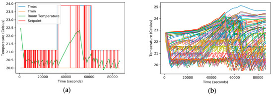 (a) Room temperature, setpoint, Tmin and variable Tmax for a single home over time; (b) Room Temperature over time for all 100 homes.