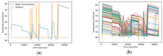 As observed in Figure 9, the setpoint is orchestrated based on the HVAC schedules and the current room temperature over time. Similarly, Figure 10a,b present the hot water temperature in the water heater tank for a single home and the water temperatures in all homes, respectively. The hot water temperatures varied between 48 °C and 60 °C degrees, as decided by the water heater agent and the optimizer.