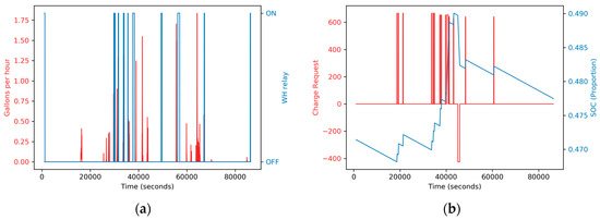 (a) Hot water consumption over time in red (left y-axis) and water heater relay over time in blue (right y-axis); (b) Charge request over time in red (left y-axis) and SOC for the energy storage system in blue (right y-axis).