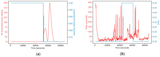 (a) Solar power generated by the PV in red (left y-axis) and capacity reduce decision that is received from the optimizer in blue (right y-axis) for a single home; (b) Total load over time in red (left y-axis) and the price signal over time in blue (right y-axis).