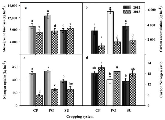 Aboveground biomass, C accumulation, N uptake, and C: N ratio of CC were all affected by year and cropping system (p < 0.05) (Table 5 and Figure 1). Among the cover crops, PG had the greatest aboveground biomass compared to cowpea and sunn hemp in 2012 when the rotation was established. While sunn hemp produced the greatest amount of aboveground biomass in 2013, followed by pigeon pea and then cowpea (Figure 1a).