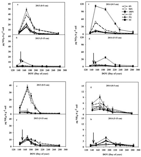 Effects of date of sampling and cropping systems on (a) NO3−-N at 0–5-cm depth in 2013; (b) NO3−-N at 5–15-cm depth in 2013 (c) NO3−-N at 0–5-cm depth in 2014; (d) NO3−-N at 5–15-cm depth in 2014; (e) NH4+-Nat 0–5-cm depth in 2013 (f) NH4+-N at 5–15-cm depth in 2013; (g) NH4+-N at 0–5-cm depth in 2014, and (h) NH4+-N at 5–15-cm depth in 2014. Arrows show the fertilizer application dates (7 June 2013 and 4 June 2014). Error bars on symbols represent standard error of treatment means for that sample date.