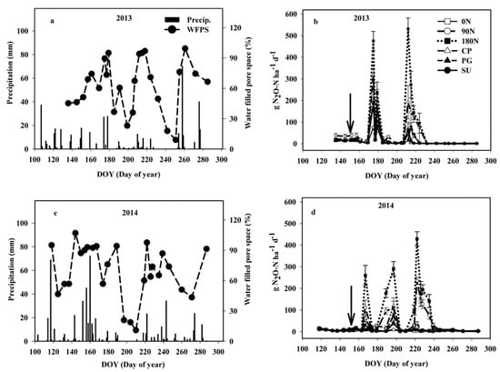 Daily (a) precipitation and water-filled pore space (WFPS) in 2013, (b) N2O-N emissions in 2013, (c) daily precipitation, and water-filled pore space (WFPS) in 2014, and (d) N2O-N emissions in 2014. Arrows show date of fertilizer application (7 June 2013 and 4 June 2014). Error bars on symbols represent standard error of treatment means for that sample date.