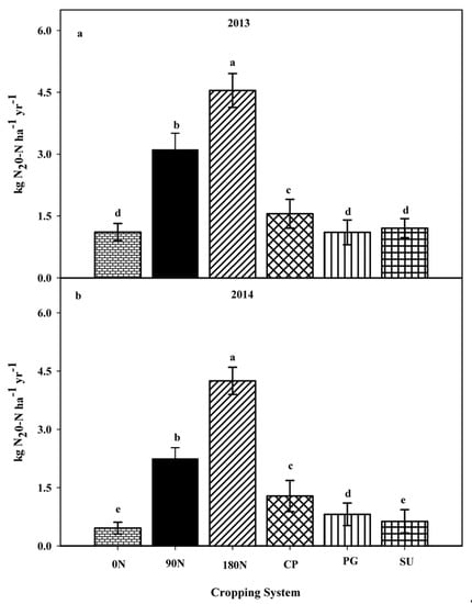A significant (p < 0.05) treatment effect was observed on cumulative N2O emissions at the end of the sampling period. The values for cumulative emissions for each treatment closely reflected daily emissions. In 2013, 180N had the greatest cumulative (annual) emissions, followed by 90N and CP (Figure 4a). No difference was detected among cropping systems with 0N, PG, and SU (Figure 4a). Similarly, in 2014, 180N had the greatest annual emission compared with cropping system with 90N and CP (Figure 4b). However, 0N and SU had the lowest cumulative nitrous oxide emissions, but was significantly higher in cropping system with PG (Figure 4b).