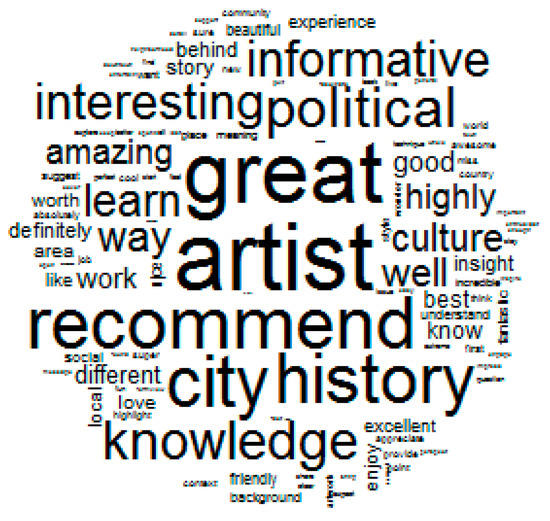 The top 50 words from the keywords analysis show that “artist” had the highest frequency with 1024 appearances, followed by “great.” Excluding sentiment words, words such as “history,” “city,” “political,” “culture,” “work,” “story,” “social,” and “background” showed high frequency. Moreover, people used words related to knowledge acquisition and influence, such as “informative,” “learn,” “know,” “insight,” “worth,” “understand,” and “meaning.” The results showed that these words played an important role in tourists’ perceptions of the Bogota Graffiti Tour. Figure 4 presents a word cloud of word frequencies results.