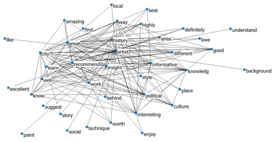 Therefore, this study analyzed the online reviews available on TripAdvisor using text mining to address the research questions established earlier. In the present study, the program R (Version 3.5.0, RStudio Inc., Boston, MA, USA) was used to analyze source codes of the homepage TripAdvisor to examine online reviews posted there, by text mining. Upon acquisition of the data of ‘online reviews’ in ‘TripAdvisor,’ the following jobs were carried out: the preprocessing of data, the extraction of keywords, the identification of the relationship between the extracted words, and the visualization of the extracted words based on frequencies through word cloud [69]. Then, the structure of the network of words was examined based on the results of the analysis for the social network analysis. In addition, unnecessary or inappropriate words for this study were removed through the general refinement procedures like tokenization, normalization, stop words, strip whitespace, tolower, and stemming. By those procedures, special symbols, spaces, numbers, English punctuation marks, and stop words were eliminated; capital and lower letters were differentiated; word roots were extracted from phrases. Furthermore, some words which could imply graffiti tours, such as graffiti, mural, tour, trip, travel, and art were excluded, since the issue of ‘nested patterns’ could occur during the text mining procedure. Next, the structure of the network of words was examined based on the results of social network analysis. To analyze the network structure between words, a co-occurrence matrix based on the frequency of occurrence between words was generated through text mining. Each word is a node in the network based on N × N matrix structure (S). From this network, degree centrality is calculated. Here, each cell, Sij, indicates the intensity between word i and word j [70]. Therefore, the word network structure based on the frequency of co-occurrence between words was presented as visualized data. Such an approach to network analysis can be regarded as appropriate to examine and compare relationships inside a network [71]. These matrices were utilized as inputs for the social network analysis software package UCINET (Version 6.624, Analytic Technologies, Lexington, KY, USA). The word networks were analyzed and visualized by NetDraw (Version 2.160. Analytic Technologies, Lexington, KY, USA).