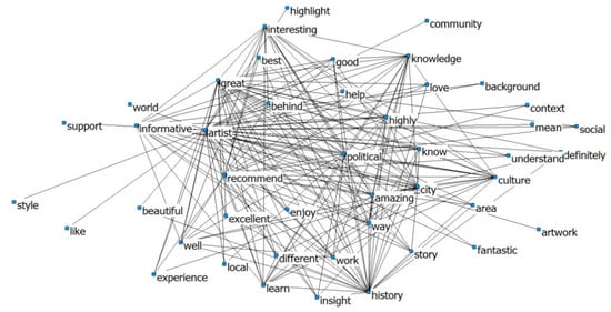 First, the mentions of history, politics, culture, and society in graffiti tours are connected with positive emotions, interest, and the insight of tourists. The results of the network analysis on words, and their frequency of use, comprise words like the above. The factors that have the most influence over tourists’ positive recognition of sightseeing spots are complex ones, comprising history, politics, culture, and society, together with the artistic perspective of graffiti. As discussed earlier, Zeppel [41] stated art invigorates tourism products, increases market attractiveness, provides new value to a region, and performs an important role in sales and promotion, while also improving product quality and appeal. Graffiti art can be a way to inspire tourists’ sympathy through content associated with politics, culture, and society. This should be considered in the development or improvement of graffiti tours.