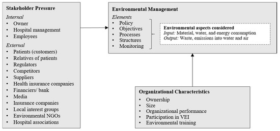 How organizations perceive and react to pressures may vary with the industry context (e.g., [59,60]). Especially service industries that differ from manufacturing industries, where the focus in research has lain thus far, are said to require more attention [61]. Aiming to understand the drivers for organizational environmental behavior means considering the respective institutional setting as the importance of stakeholders for driving organizational EM may vary from sector to sector. In the following, the German hospital sector with its most relevant stakeholders is described, i.e., regulators, suppliers, top managers, employees, federal states, suppliers, insurance companies, owners, patients, and their relatives.