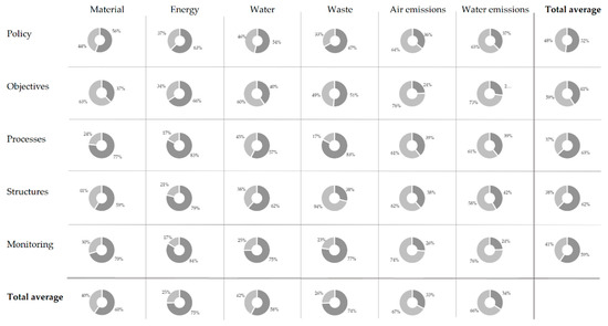 OEP was measured by looking at how many environmental aspects (material, energy, water, waste, emissions to air, wastewater) were addressed in the different management dimensions (policy, objectives, processes, structures, monitoring). In total, a company could score a maximum of 6 points in each management element category if all aspects were addressed and a minimum of 0 points in case none of the aspects were addressed. Under the assumption that all aspects are equally important, no weighting was applied when calculating the score for each company.